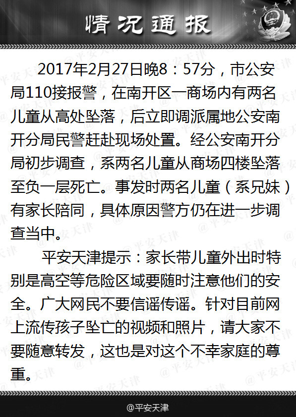 通报称,2017年2月27日20:57分,市公安局110接报警,在南开区一商场内有两名儿童从高处坠落,后立即调派属地公安南开分局民警赶赴现场处置。经公安南开分局初步调查,系两名儿童从商场四楼坠落至负一层死亡。事发时两名儿童(系兄妹)有家长陪同,具体原因警方仍在进一步调查当中。