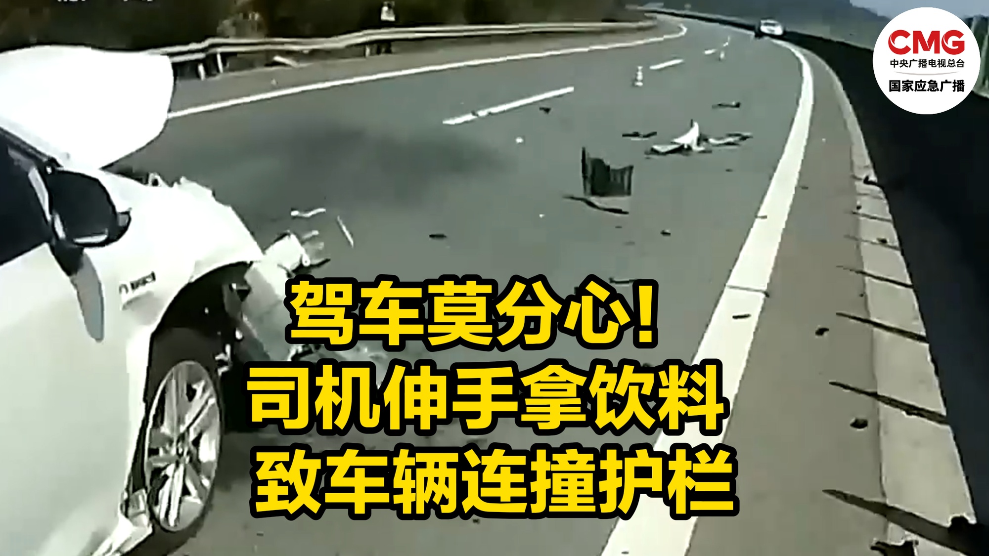 驾车莫分心!司机伸手拿饮料致车辆连撞护栏
